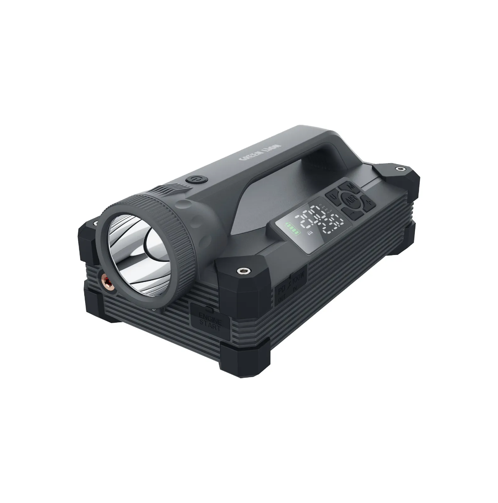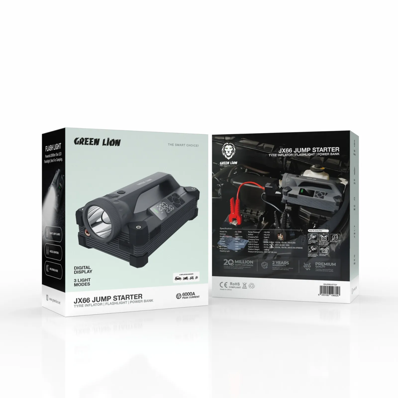 جامپ استارتر و پمپ باد مدل JX66 برند گرین لاین ابزاری قدرتمند و مقاوم است که شما را در مواقع ضروری آماده نگه می‌دارد. با باتری 24000mAh با توان 88.8W، این دستگاه برای استارت خودروهای با سیستم 12 ولت از 2000A تا 6000A طراحی شده است. همچنین دارای یک پاور بانک PD 65W است که برای شارژ سریع دستگاه‌ها از طریق پورت‌های Type-C و USB-A مناسب است.