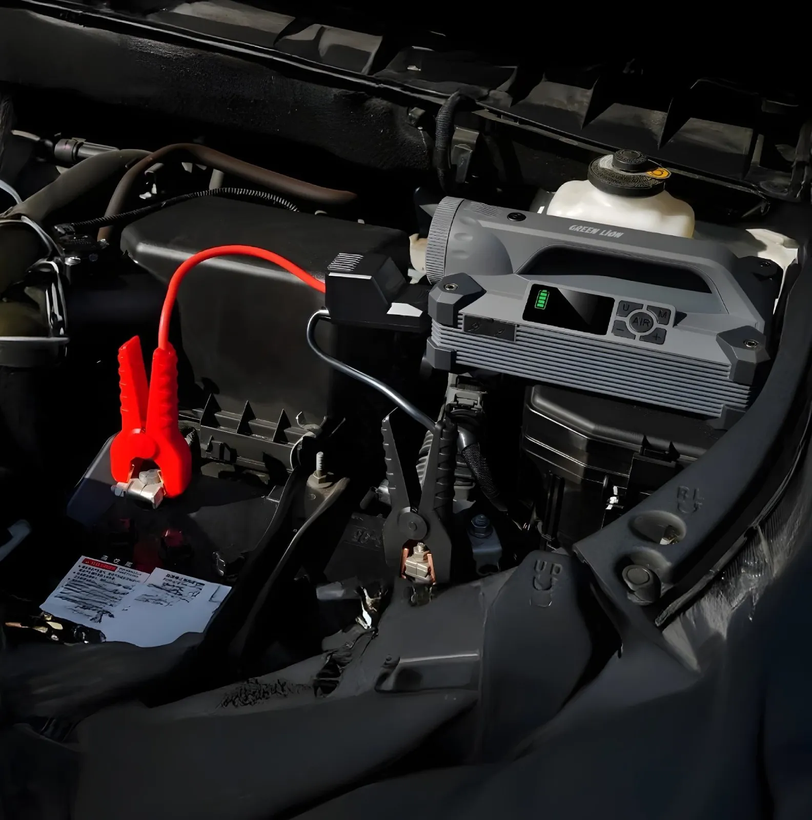 جامپ استارتر و پمپ باد مدل JX66 برند گرین لاین با باتری 24000mAh و پمپ باد 150PSI، مجهز به چراغ LED 15W و شارژ سریع PD 65W برای استفاده در شرایط اضطراری.