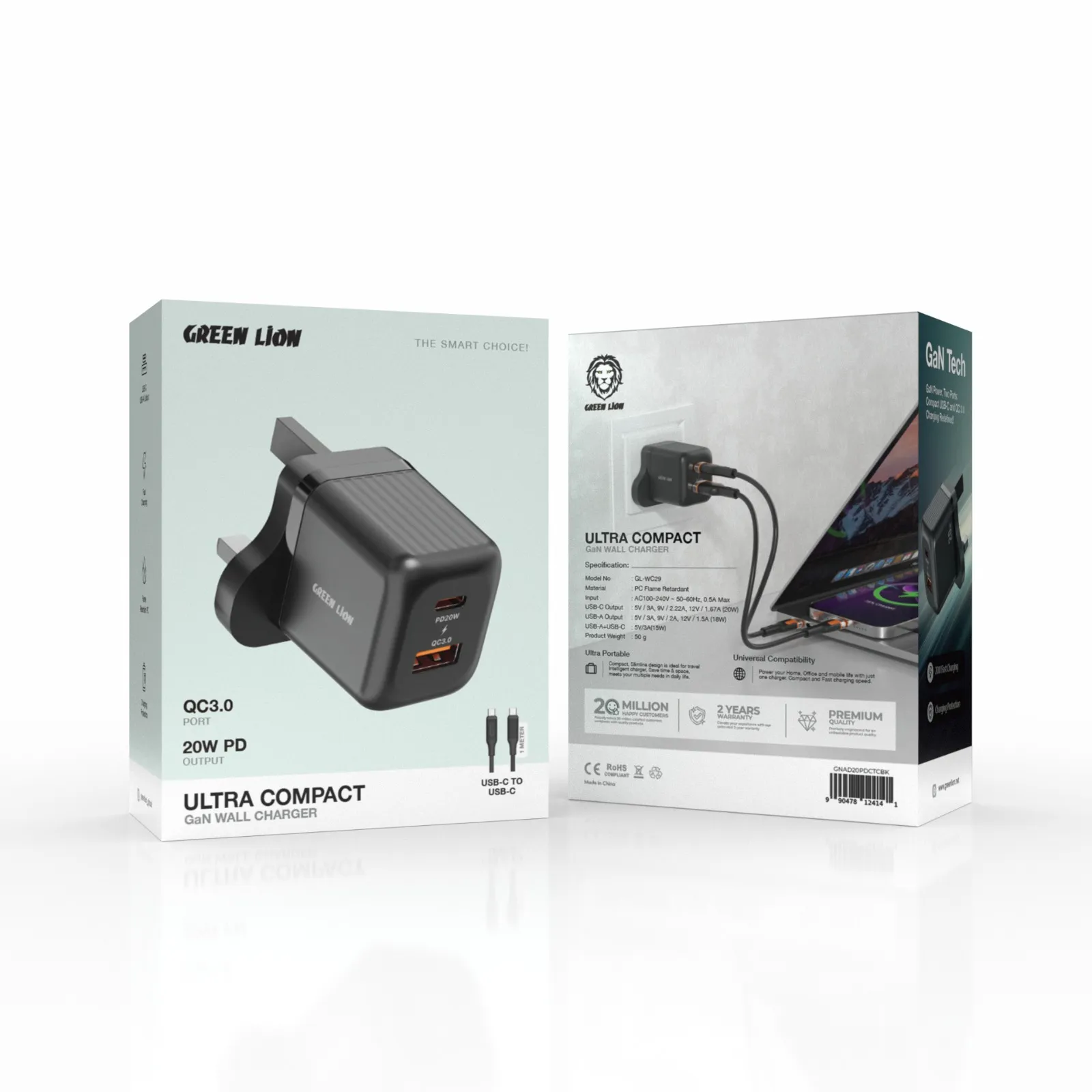 شارژر دیواری گرین لاین مدل Ultra Compact GaN با دو پورت A و Type‑C و کابل Type‑C همراه، سرعت شارژ فوق‌العاده‌ای ارائه می‌دهد. طراحی کوچک، بدنه نسوز و فناوری QC3.0 آن را برای سفر و استفاده روزانه مناسب کرده است.