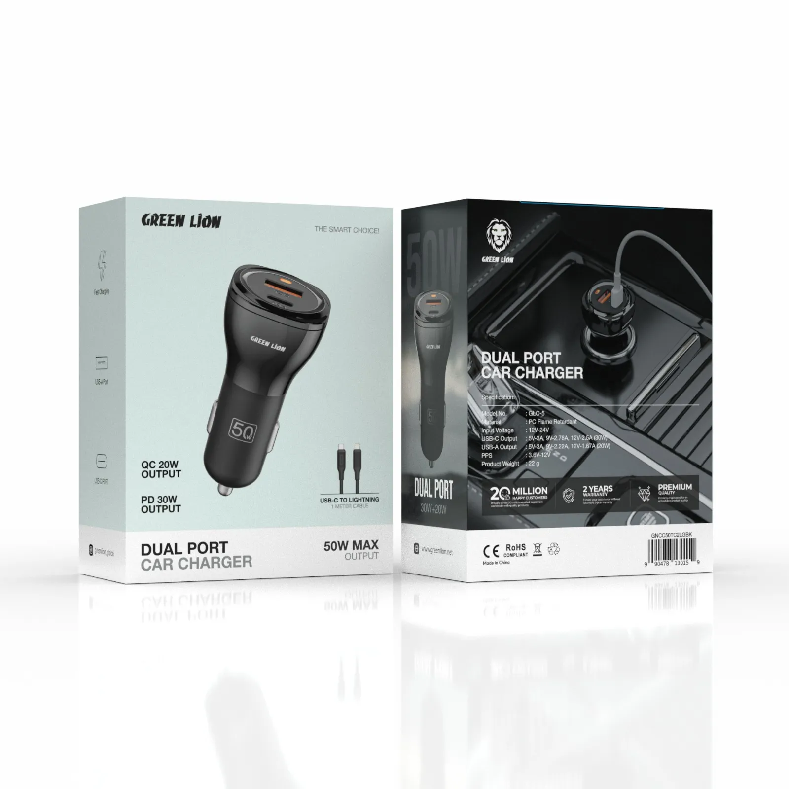 در بسته یک کابل تایپسی به لایتنینگ با طول ۱ متر قرار دارد که نیاز کاربران اپل را برطرف میکند. شارژر فندکی گرین لاین ۵۰ وات انرژی سریع و مطمئن را در سفر، مسیرهای روزانه و هر شرایطی فراهم میسازد.