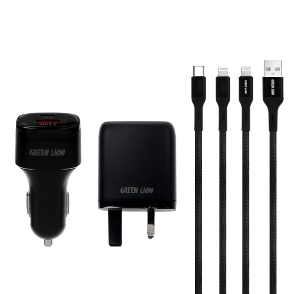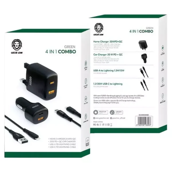 شارژر 4 کاره گرین Green 4IN1 Combo با شارژ سریع PD و QC، شامل شارژر دیواری و فندکی 20 وات به همراه دو کابل لایتنینگ 1.2 متری، همه نیازهای شارژ شما را در خانه، محل کار و خودرو تأمین میکند.