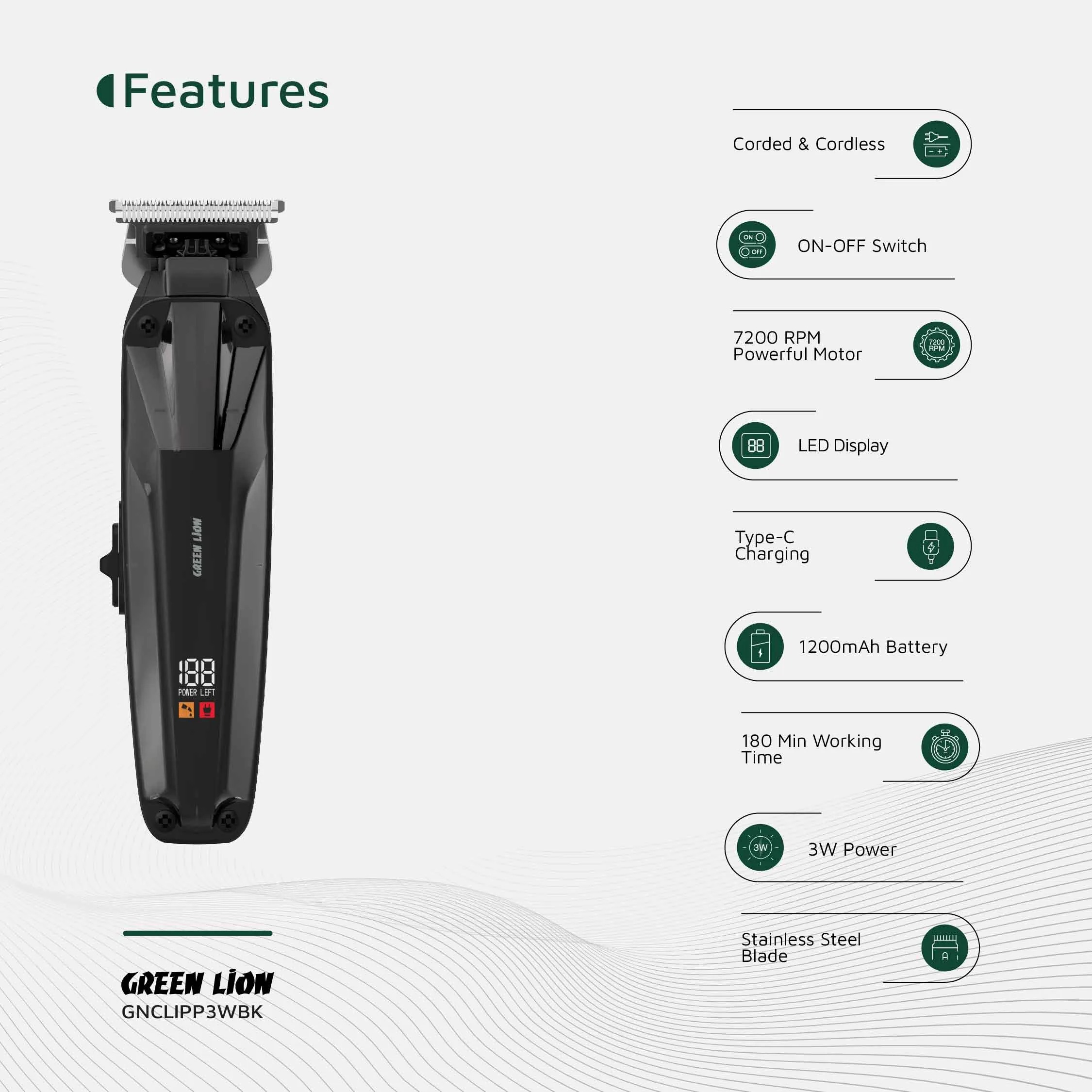 نمایشگر LED میزان شارژ را لحظهبهلحظه نشان میدهد تا زمان اصلاح بهخوبی مدیریت شود. بدنه ارگونومیک ABS + PC کنترل و راحتی در دست را تضمین میکند. این دستگاه هم بهصورت با سیم و هم بیسیم کار میکند و برای آرایشگران و استفاده شخصی مناسب است.