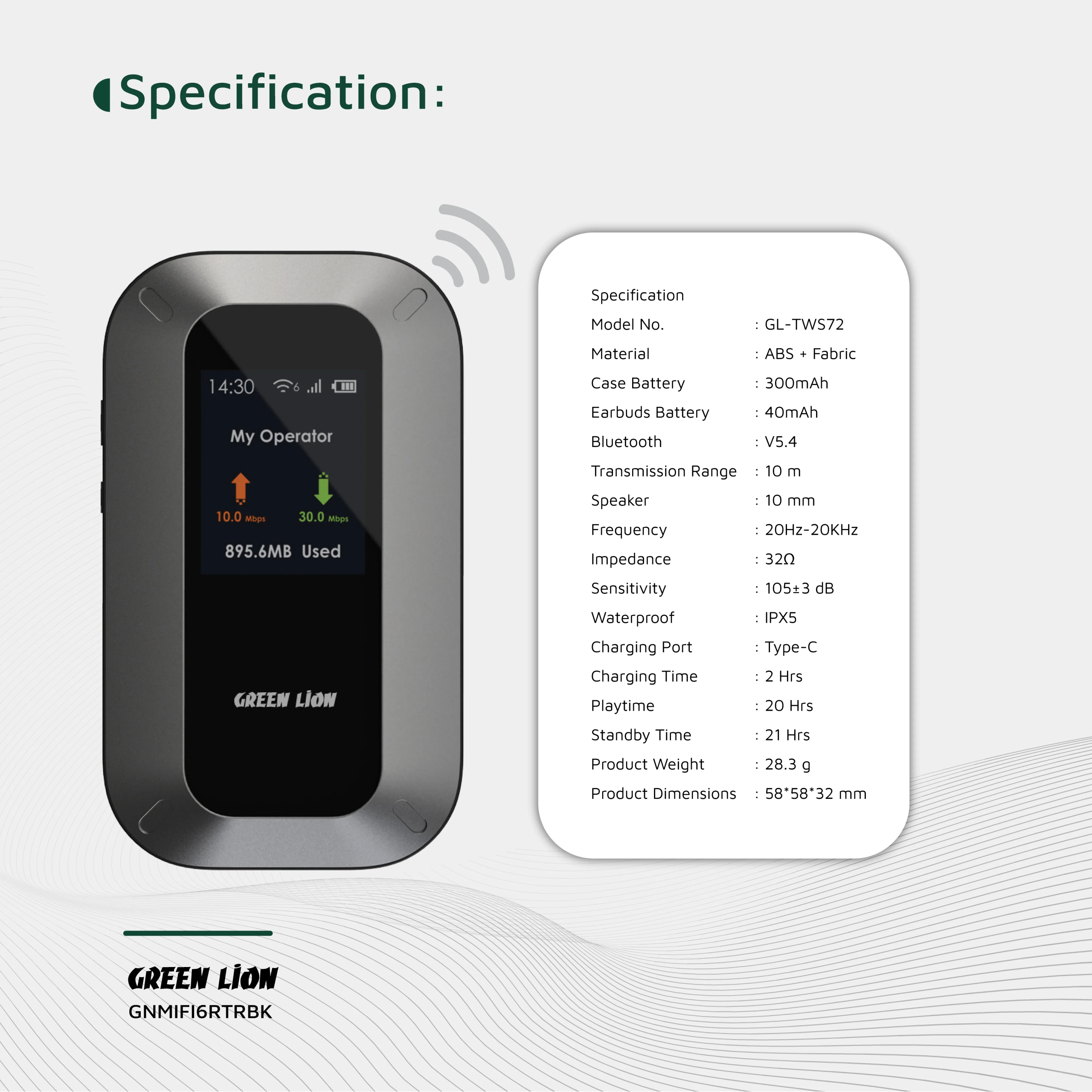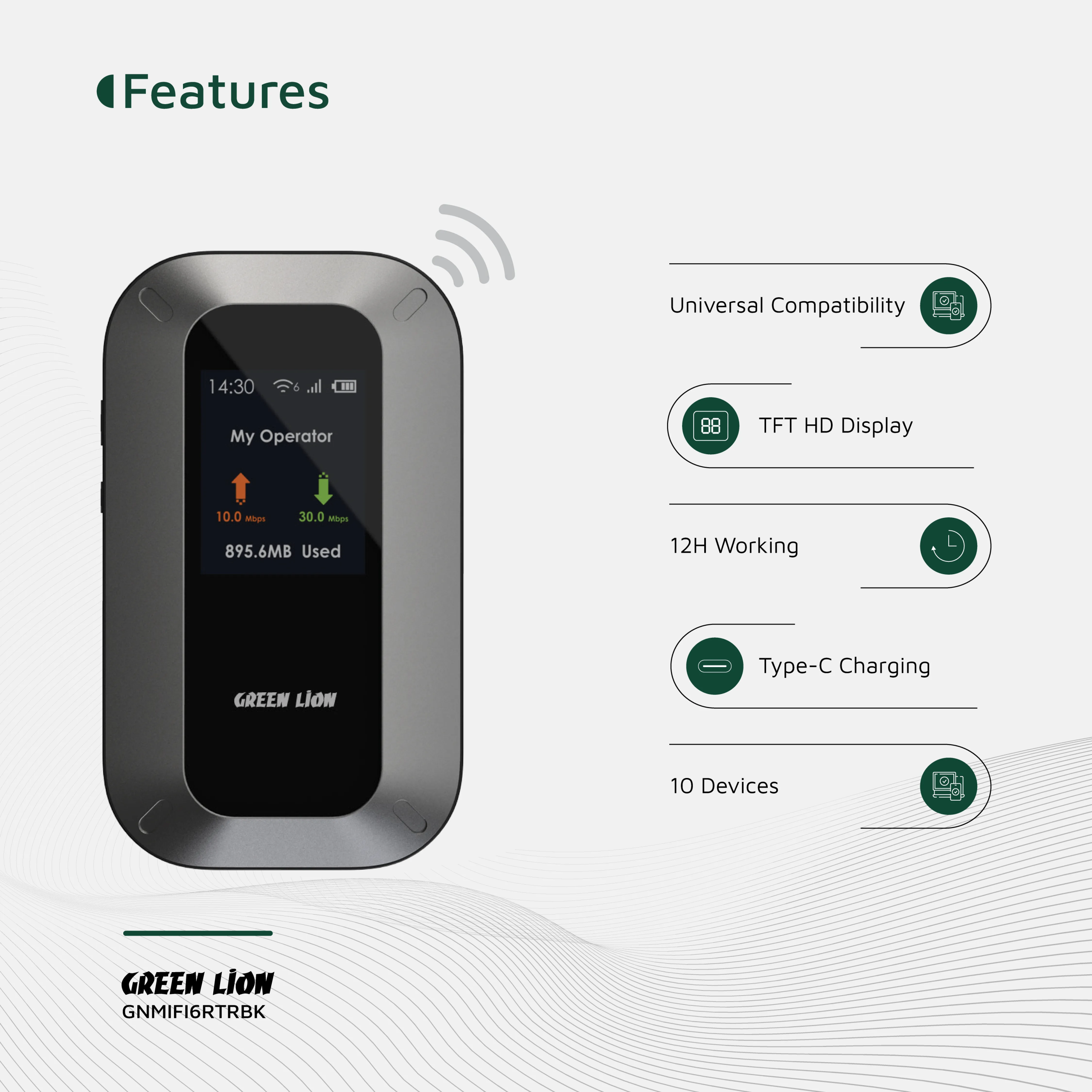 مودم قابل حمل گرین لاین از باندهای متنوع LTE، HSPA، EDGE و GSM پشتیبانی می‌کند و سرعت دانلود آن به ۱۵۰ مگابیت بر ثانیه می‌رسد. همچنین می‌توانید تا ۱۰ دستگاه مختلف را به‌صورت هم‌زمان از راه WiFi یا USB متصل کنید.