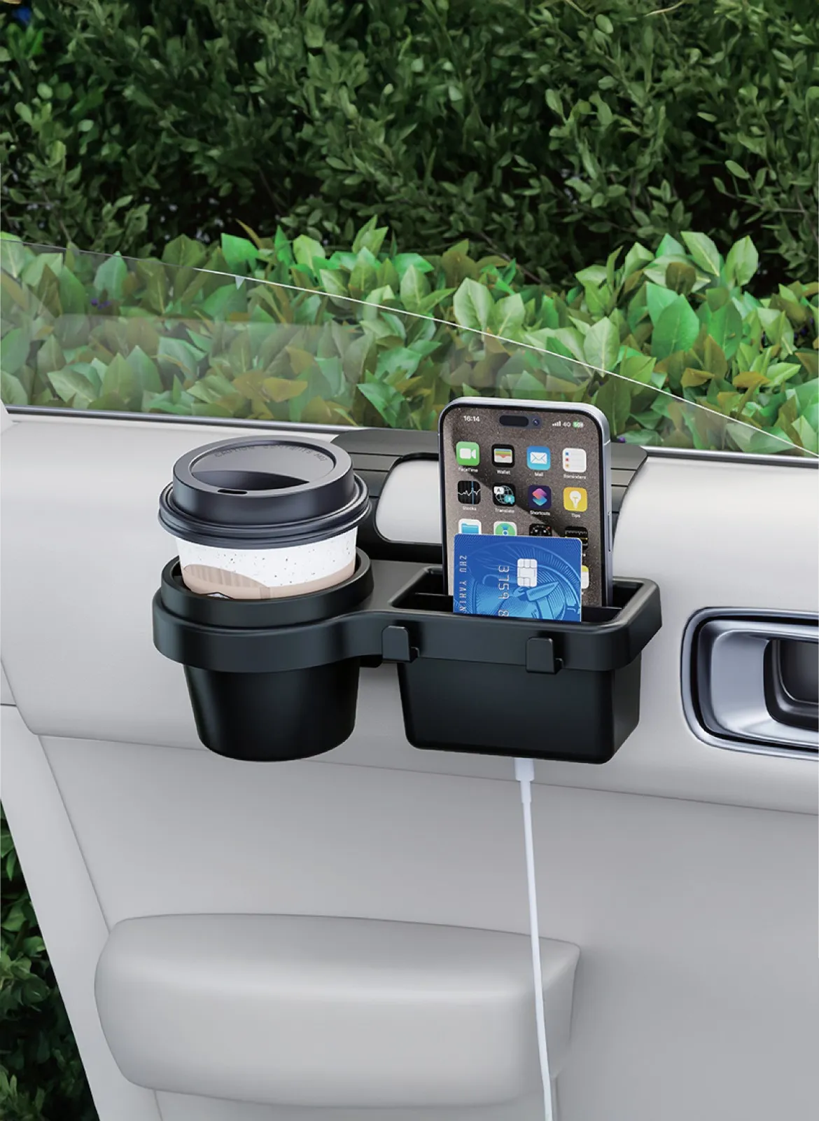 دارای قلاب‌های آویز، پد فومی قابل تنظیم، جایگاه فنجان ضد لرزش، محفظه کابل شارژ
