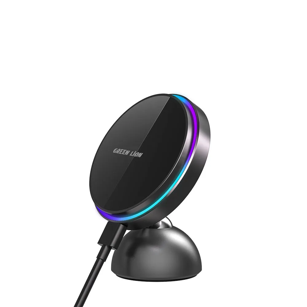 خروجی 15W، 7.5W و 5W، ورودی 5V/2A، 9V/2A و 12V/2A، استفاده از 17×N54 Magnet برای اتصال پایدار، طراحی انعطافپذیر برای تنظیم زاویه دید، نور Ambient و RGB، استانداردهای CE و RoHS، ابعاد حدودی 79.22×63.07×45.52 میلیمتر و وزن تقریبی 128.5 گرم |
