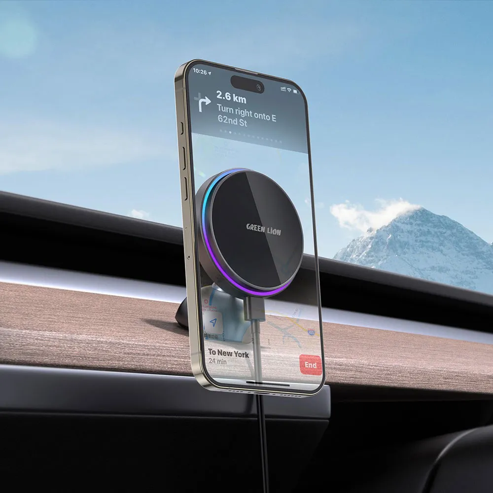 هولدر مگ سیف خودرو MagSafe مدل Magprime گرین لاین گوشی را با مگنتهای قدرتمند N54 محکم نگه میدارد و همزمان شارژ بیسیم سریع ارائه میکند. طراحی انعطافپذیر، متریال مقاوم و نور RGB، این پایه را به گزینهای مدرن و کاربردی برای رانندگی روزانه تبدیل کرده است.