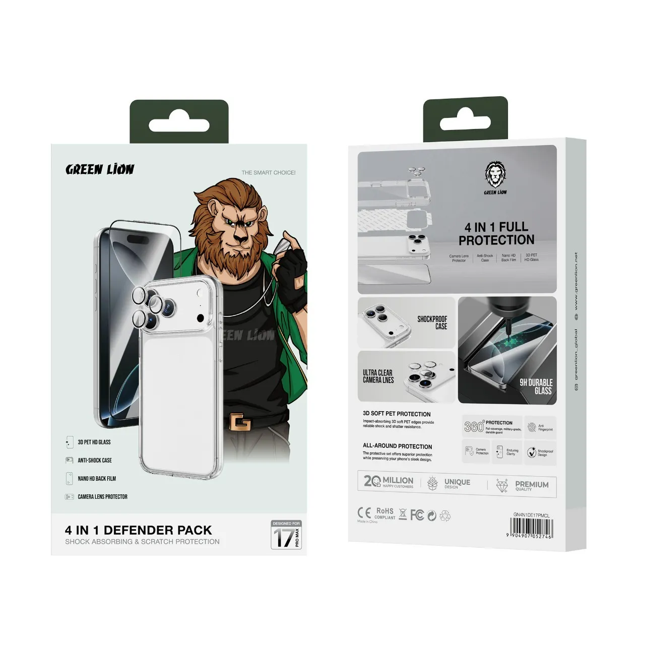 پک محافظ ۴ در ۱ آیفون 17 پرو گرین‌لاین یک مجموعه کامل شامل قاب ضدشوک، محافظ لنز، شیشه PET سه‌بعدی و فیلم نانو HD پشت است. این پک بدون ایجاد ضخامت، از گوشی در برابر خط‌وخش و ضربه محافظت می‌کند و ظاهر شیک دستگاه را حفظ می‌کند.