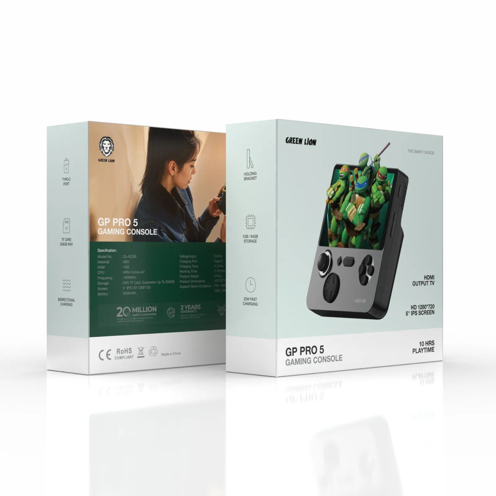 GP PRO 5 از امولاتورهای متنوع مانند PS1، MAME، MD، SFC و NEOGEO پشتیبانی میکند. همچنین خروجی HDMI اتصال آسان به تلویزیون را ممکن میسازد. پایه نگهدارنده داخلی تجربه بازی ایستاده یا رومیزی را راحتتر میکند.
